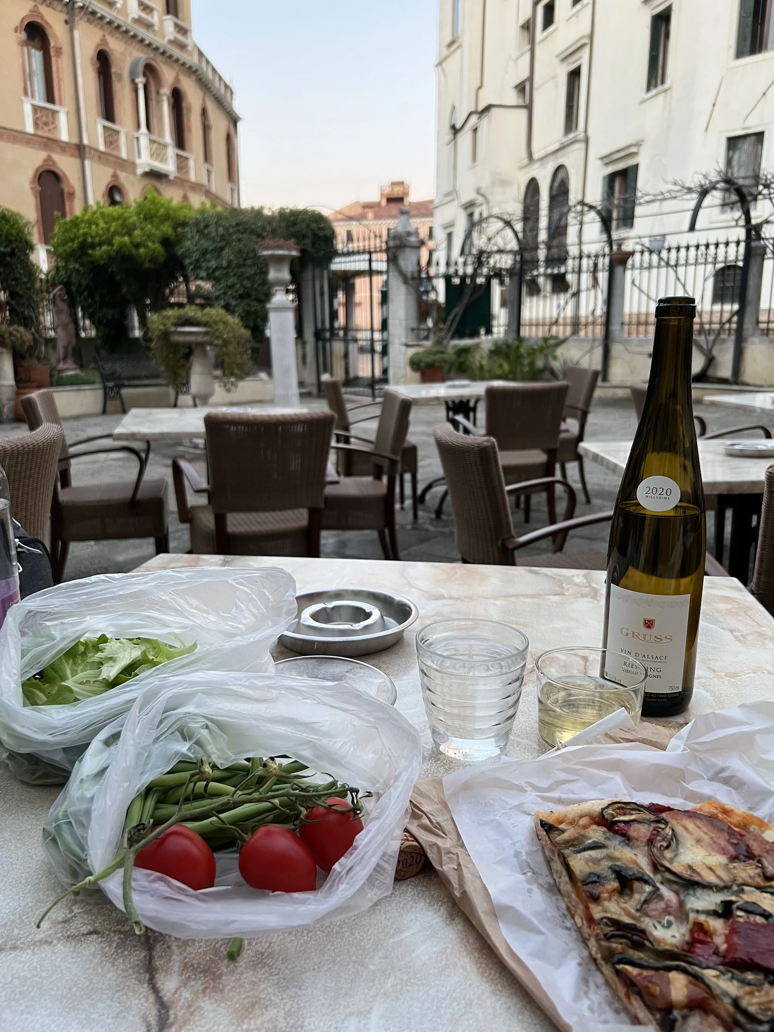 One night, in my ongoing pursuit of vegetables, I went to a small vendor who was set up in Campo Stefano and bought fresh green beans, tomatoes, and a giant bag of arugula. I ate that, along with a side dish of veggie pizza and a bottle of wine, in the garden of my pensione. And, because I was within WiFi distance of the hotel, I was able to talk to my mom for two hours as the day turned into night. It felt really nice to get a serving of home along with my veggies.